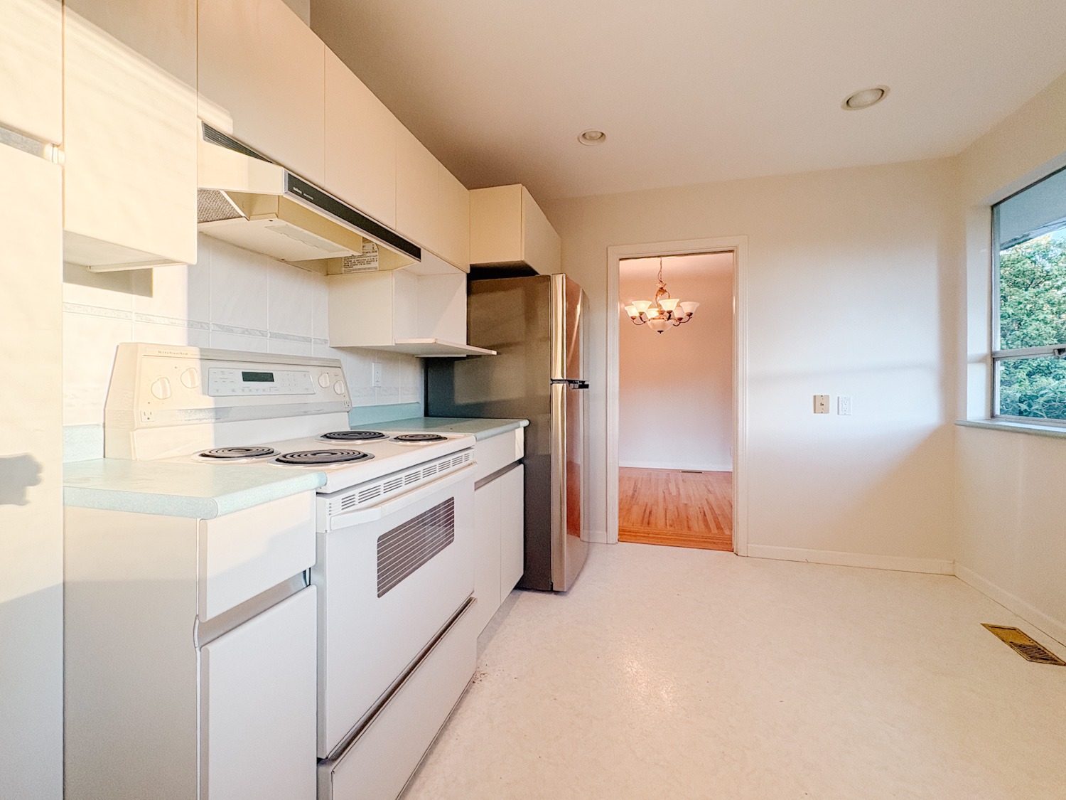 The kitchen has been updated with a stainless steel range, installed since the photos were taken.